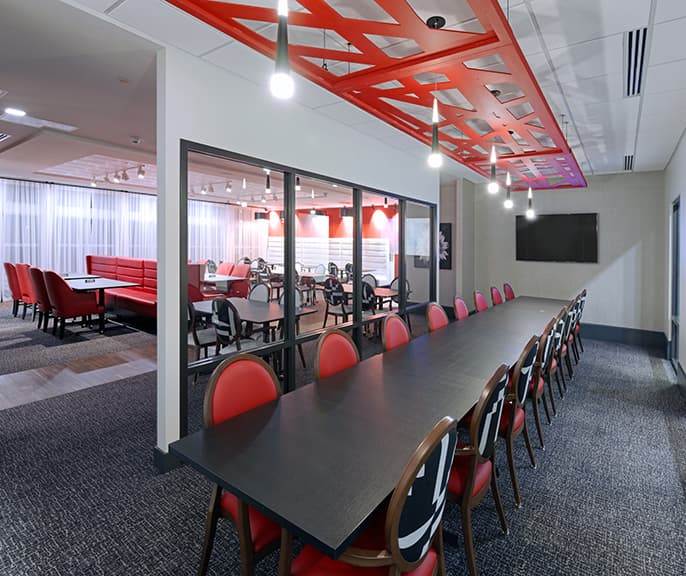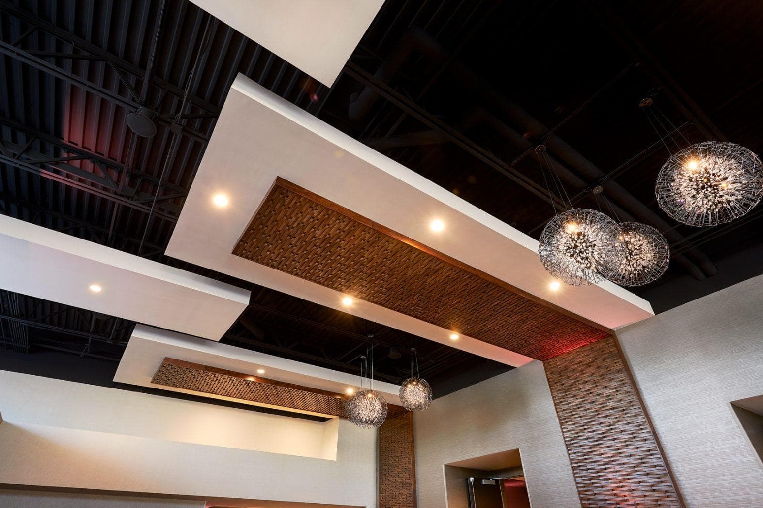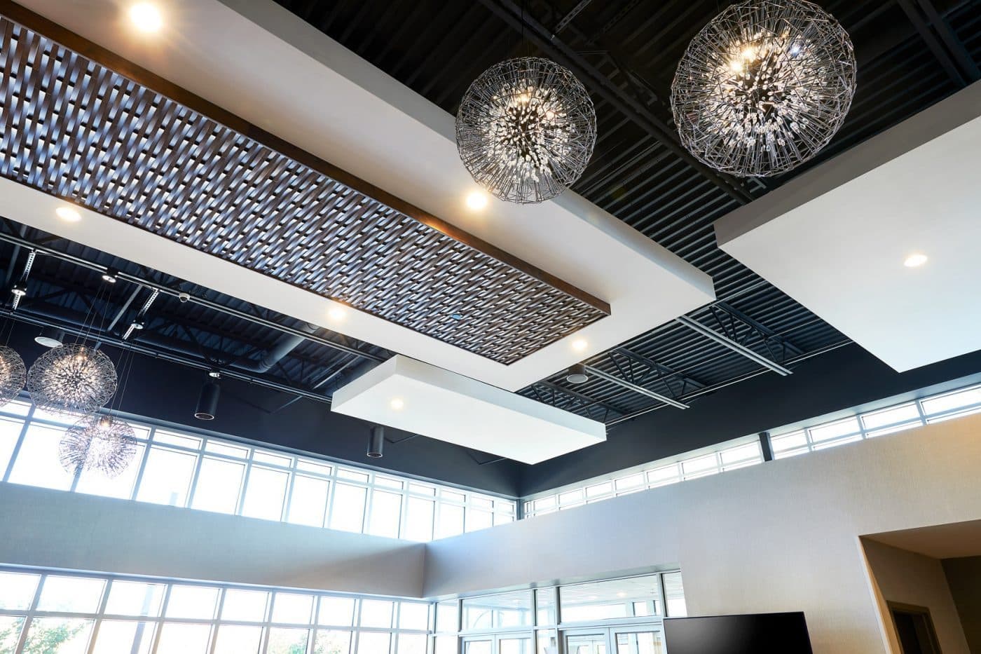 Buxton Kubik Dodd, an architecture & design firm approached Paragon to support with the infill of the break room and common spaces at Mid-Missouri Bank. The modern design of the space called for a wooden trellis ceiling structure, but due to fire safety requirements, wooden beams were not an option. There was also a need to consider the acoustics of the space. We developed a custom solution that included an aluminum channel that could be wrapped with a wood-grain vinyl to create the trellis ceiling structure. This approach keeps the visual appeal of wooden beams while keeping everything up to code. Check out the full project profile here.