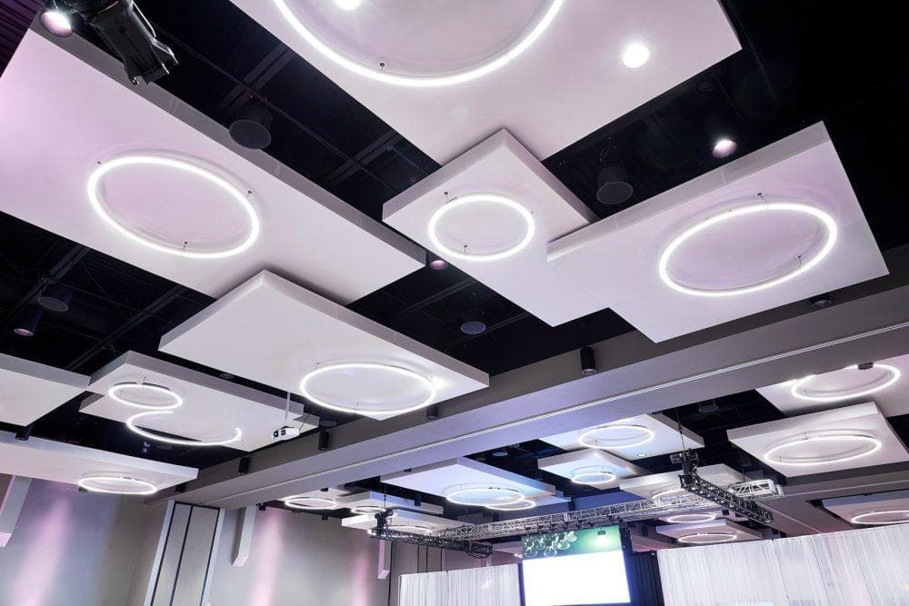 It's always a pleasure to work with clients on corporate office designs in Springfield, Missouri. O'Reilly Hospitality Management approached us with the task of controlling acoustics in its state-of-the-art convention center. We developed a system of 28 Fabri-clouds that float below the ceiling, leaving room for lighting installation and sprinkler systems. We love a good challenge and this one gave us a chance to get creative with our planning. Check it out!
