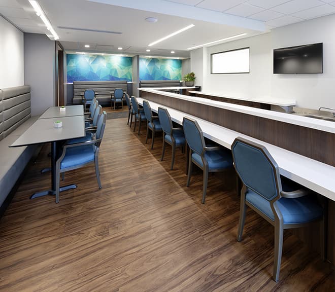 Turner's Rock is a retirement facility in Springfield, Missouri, but we never wanted it to look like one. We worked with architecture & design firm, Buxton Kubik Dodd, to design and create custom elements to bring the modern vision to life. We developed custom decorative wall panels that elevated the design in a functional way. We also built a decorative ceiling cloud for the common area to help with the acoustic properties while adding a unique piece to the space. We are product to partner with designers and architects to bring spaces to life